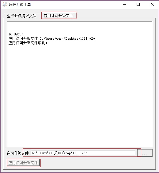 用戶還是在RUS工具里面,加載這個(gè)回傳的v2c文件,插上對(duì)應(yīng)的超級(jí)狗,點(diǎn)“應(yīng)用許可升級(jí)文件”完成升級(jí)。