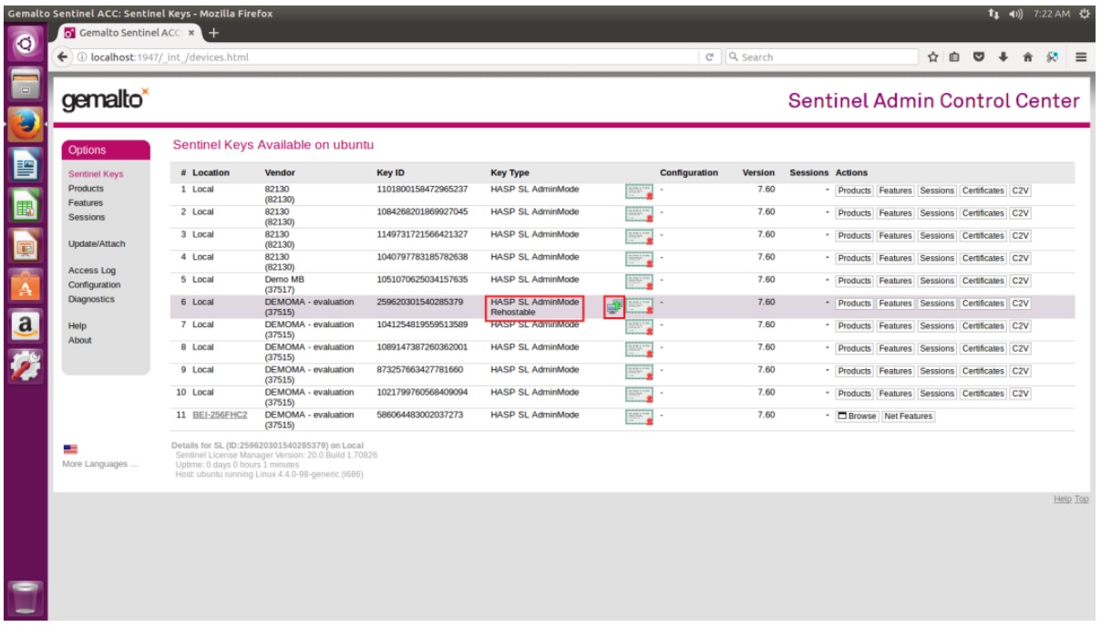SL能夠?qū)崿F(xiàn) Rehost 的前提條件是 SL本身是可遷移的,也就是 Rehostable 的??梢赃M入 A 電腦上打開 ACC(瀏覽器打開 http://localhost:1947,點擊 Sentinel Keys 查看 SL的狀態(tài)),如下邊截圖所示紅色框?qū)?yīng)的這個 SL就是 Rehostable的,可以遷移,其它SL都不可遷移。如果想遷移其它 SL,就必須將 SL升級為具備 Rehostable 屬性。 具體請看下邊的步驟二。