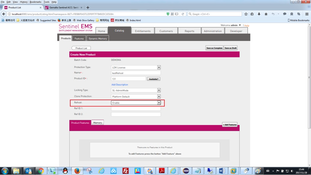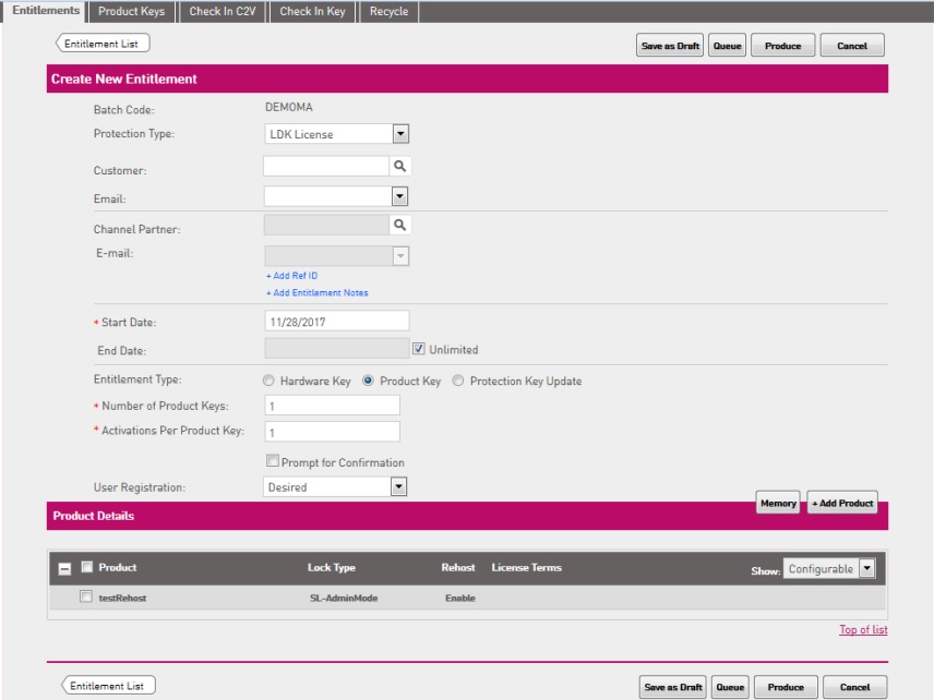 (c、 )去 EMS 里邊Entitlement 標(biāo)簽頁下,像正常升級加密鎖一樣的標(biāo)準(zhǔn)步驟進行操作。新建 Entitlement,然后Entitlement type選擇中間的Product Key,添加上剛才定義的產(chǎn)品testRehost,然后點擊 Produce,接著 Activate。