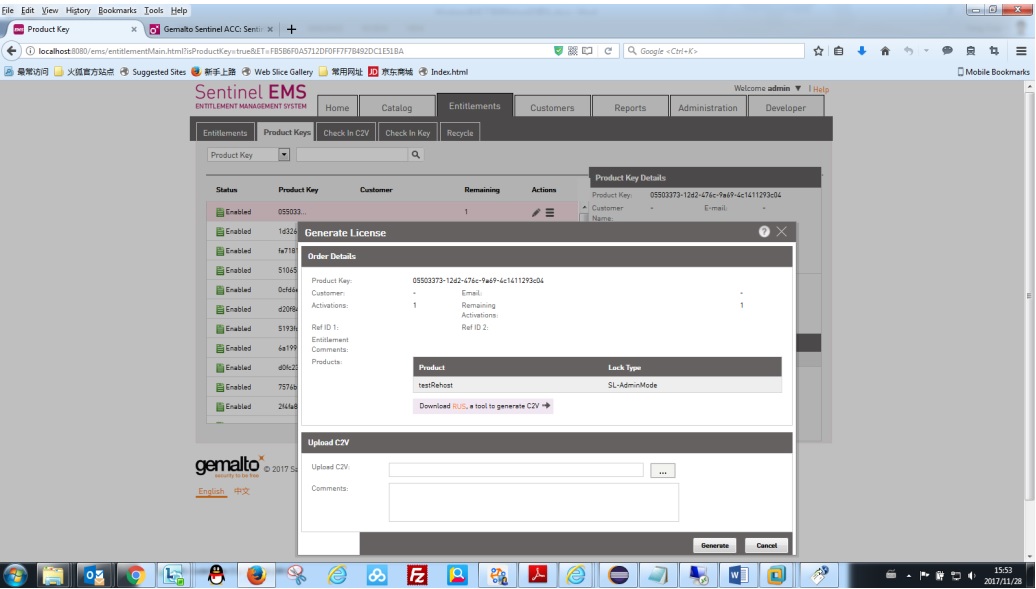 在Generate License窗口中,Upload C2V選擇之前A電腦上需要升級的SL產(chǎn)生的testRehost.c2v文件。然后點擊 Generate產(chǎn)生對應(yīng)的v2c 升級文件。
