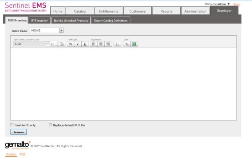 去開發(fā)電腦上打開 EMS,進入 Developer 標(biāo)簽頁,可以看到RUS Branding標(biāo)簽頁, BatchCode選擇你的正式號(比如截圖中的 KEOKE),插上主鎖,點擊左下角的 Generate,就可以產(chǎn)生正式號對應(yīng)的 RUS 遠(yuǎn)程升級工具。