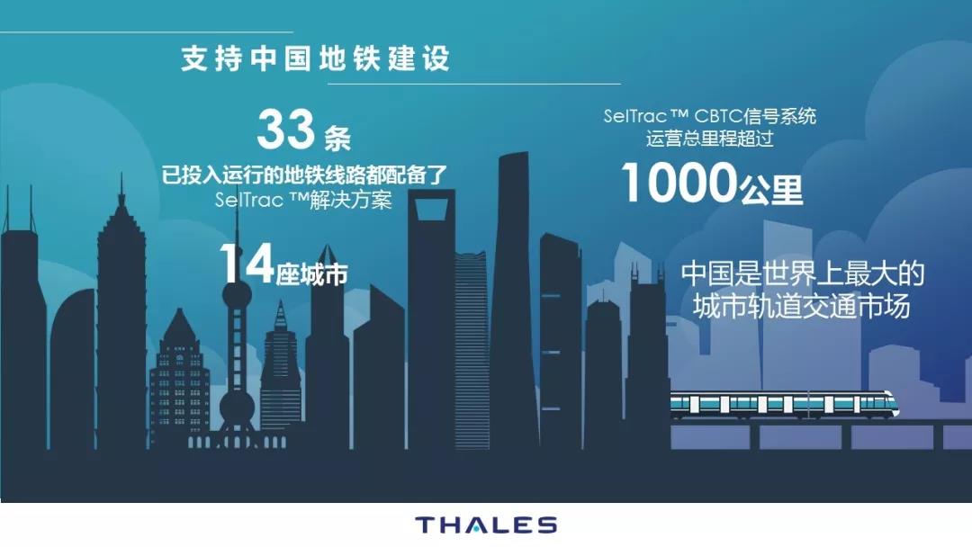 泰雷茲通過其合資公司上海電氣泰雷茲交通自動化系統(tǒng)有限公司為中國大型城市(包括北京、上海、廣州、深圳、武漢、南京、南昌、合肥、青島、石家莊、寧波、濟南等14 個城市的33條線路)的軌道交通網(wǎng)提供先進的CBTC 信號系統(tǒng),總里程 1280 公里。
