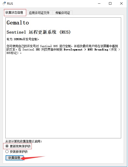 選擇“更新現(xiàn)有的保護鎖”,點擊收集信息,會生成一個擴展名為.c2v的文件,將此文件保存后發(fā)給軟件開發(fā)商。
