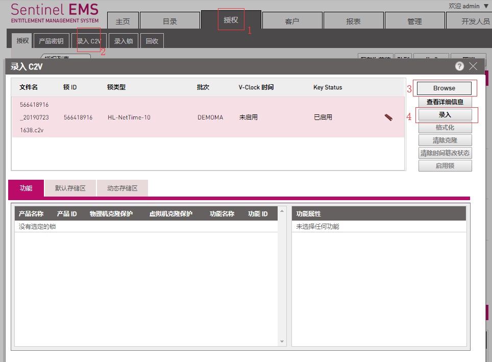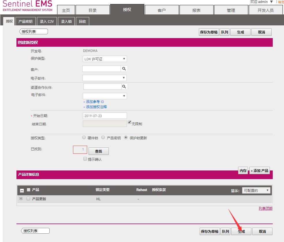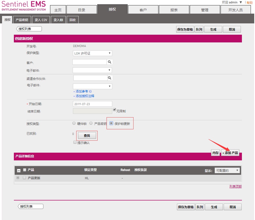 3、軟件開發(fā)商在收到此c2v文件后,將此文件錄入到EMS中,然后將需要更新或添加的內(nèi)容按正常子鎖授權流程新建產(chǎn)品和新建訂單。