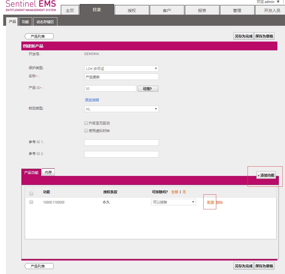 (2).在新建產(chǎn)品頁面,添加新的Feature ID或在“配置”中修改原來加密鎖中的Feature ID屬性(如修改到期時間等)