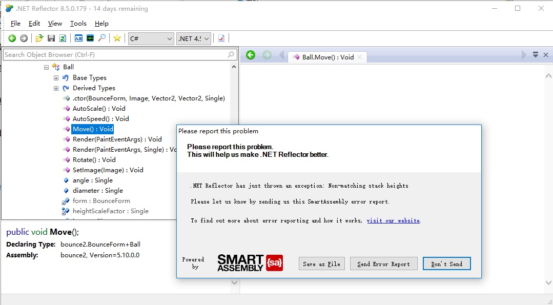 將加密后的程序,拖入.NET Reflector,找到對(duì)應(yīng)的move(),可以看到軟件無(wú)法解析該方法,直接報(bào)錯(cuò)。