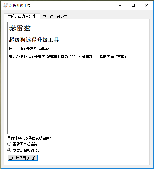 選擇【安裝新超級狗SL】,并點擊【生成升級請示文件】,將會生成一個擴展名為“c2v”的文件,將此文件發(fā)送給軟件開發(fā)商。